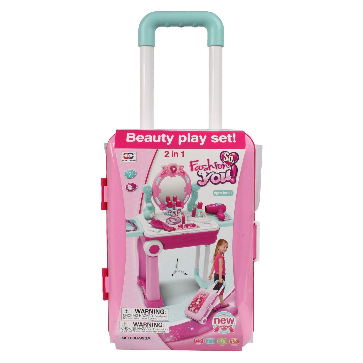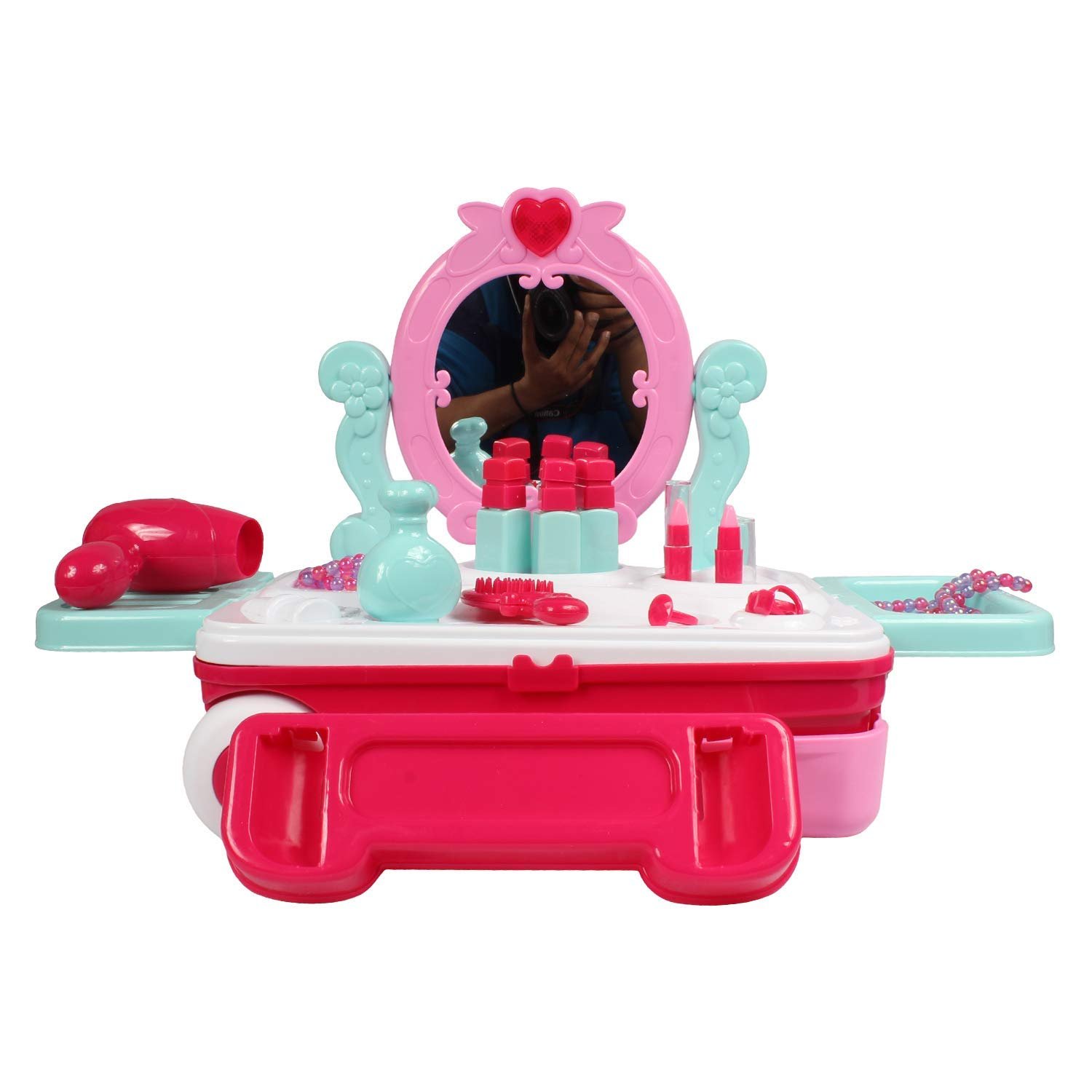 Description: This Girls Simulation Dressing Table Toy is a great way to help develop a sense of fashion and image. Kids learn through the use of their imaginations.It comes with Dresser, Mirror, Hair Styling Tools, Makeup, and Accessories, gives your little princess everything she needs to stylize her look.It is a great way to encourage creative play and motor skill development.