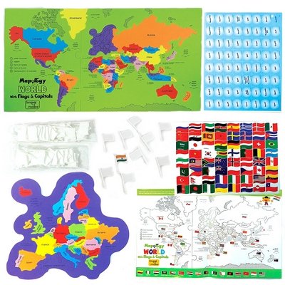 Description: A unique and fun foam puzzle specially design to explore and learn about countries, their flags and capitals across the world. This entire puzzle is a great learning aid to europe and world map that comes with 3 foam puzzle frames - 2 for world map and 1 for europe map, to help children get a magnified view of popular european country. The puzzle accompanies 83 nation pieces cut in as per political map shapes and snugly fit with each other to create an impact of the world map, which ensure hours of fun and constructive play time for kids. The toy pack also contain sticker for flags and capital of 83 countries from around the world. Stick the flag sticker on one side and capital sticker of the same country on other side of the flag and place the flag on the belonging countries. Guiding instruction is provided with in the box to help kids place right flag on the right country.